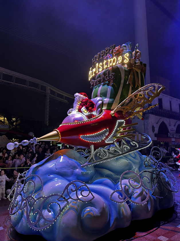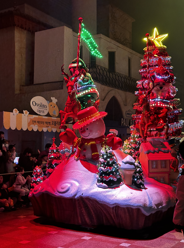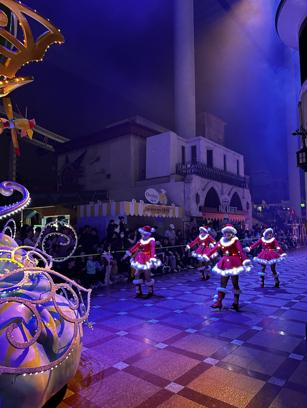 20시가 되자 조명과 음악이 어우러진 크리스마스 퍼레이드가 시작되었고, 아이는 가까운 거리에서 펼쳐지는 공연에 집중하며 매우 즐거워했습니다. 퍼레이드 관람 후에는 간단히 간식과 기념품을 구경하며 여유롭게 밤 시간을 마무리할 수 있었습니다.